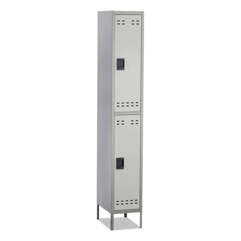 Heavy gauge, all-steel construction and strong uni-body design stand up to tough conditions. Convenient storage with double hook and bar. Raised 6″ off the floor for easier access and perforated for ventilation. Recessed handle with padlock provision has no protruding parts. Fully assembled units can be linked together for greater capacity. Individual Lockers. Color: Two-Tone Gray; Overall Width: 12″; Overall Depth: 18″; Overall Height: 78″.