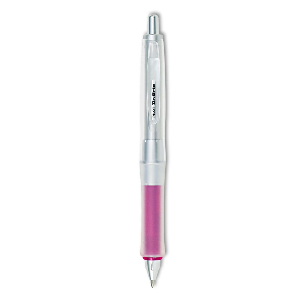 Designed with perfect weight distribution for comfortable, balanced writing. Contoured, wide double-layer grip and balanced gripping axis reduce writing stress and alleviate hand fatigue. Ink is extra long-lasting and provides an ultra-smooth writing experience. Recommended for Ease-of-Use by the Arthritis Foundation. Silver-toned barrel with colored grip and metal accents. Retractable and refillable for continued use. Silver Barrel/Pink Grip. Pen Sub-Brand & SKU Line: Dr. Grip Center of Gravity; Pen Style: Retractable; Pen Type: Ballpoint Pen; Refillable (Yes/No): Yes.