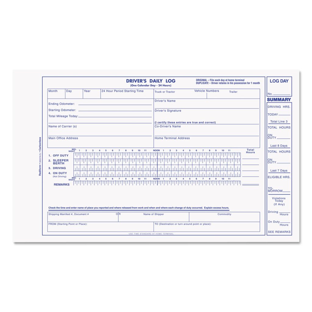 Log a day’s driving summary in separate section at right side of each form. Vehicle report on back of original with odometer start and finish, mileage today, time in, stops, time out, layover time, daily vehicle inspection report.