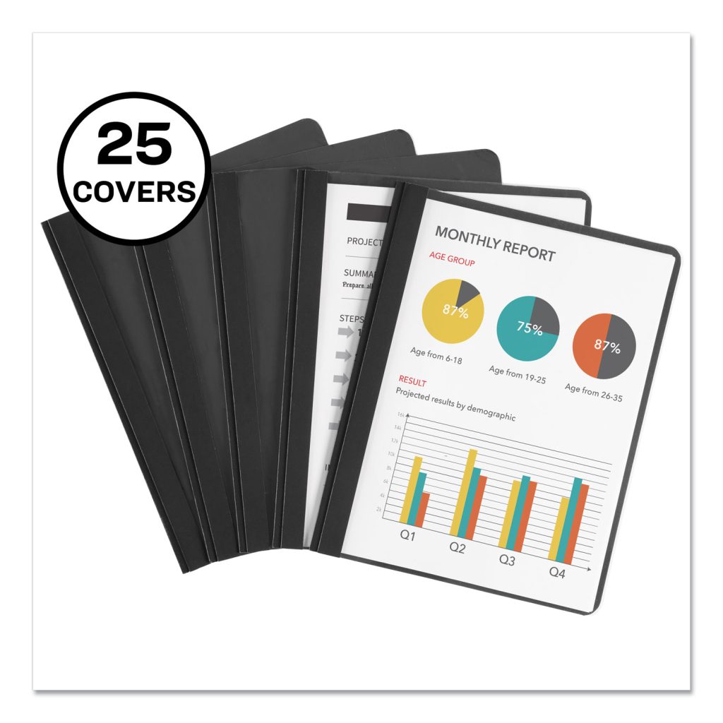 Create professional-looking reports with Avery Durable Clear Front Report Covers. These 8.5″ x 11″ clear front report covers with fasteners feature three double-prong metal fasteners designed to keep your documents secured. These metal double-prong fasteners are also designed to completely bend, making your report lay flat and hold tight. These presentation folders feature a clear view front cover designed to hold a customizable title page. Whether your documents are for school, home, or work, use the predesigned binder templates and designs at avery.com to create a report cover page. The durable clear front and thick coated paper back helps keep your report clean and protected. Front Cover Color(s): Clear; Color Family: Clear; Back Cover Color(s): Black; Sheet Size: 8.5 x 11.
