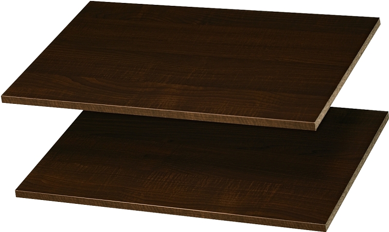 Adjustable shelves rest on included pins or can be secured in place. Contains two shelves, can be cut to desired size if needed. Scratch and moisture-resistant surface. Hardware is included.