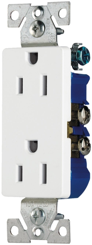 Decorator receptacles feature longer, wider straps providing 40% more contact area to wall board. Virtually eliminates floating installations. Patented built-in wire stripper for #14 and #12 wire to speed installation. Patented built-in wire looper for pre-looping. Tri-combo screws accept slotted, Phillips and Robertson-head tools for installation flexibility. Terminal screws backed out – ready for wiring. Side wire terminals accept up to #10 solid or stranded wire. Push-in terminals accept #14 solid wire.