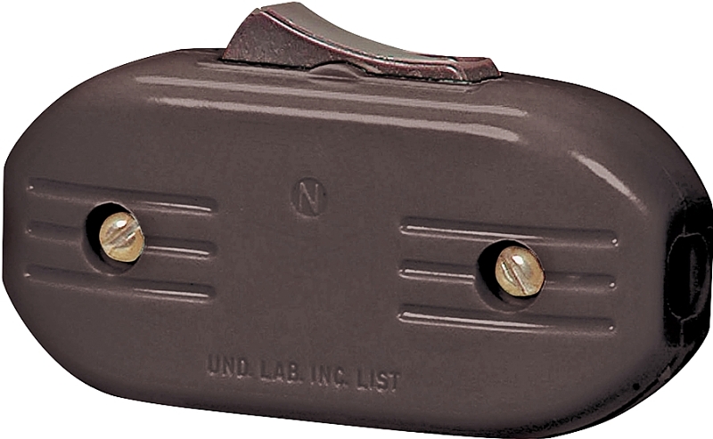 Feed-through In-line On/Off cord switch, single pole, screw terminals. 3 A, 120 VAC. For flat or round cords, 18/2 SPT-1, SPT-2, HPN, 16/2 SPT-1, SPT-2, HPN, round cords, type SVT, maximum diameter 9/32 in. Temperature rating of -40 to 65 deg C. UL listed, meets all CSA requirements.