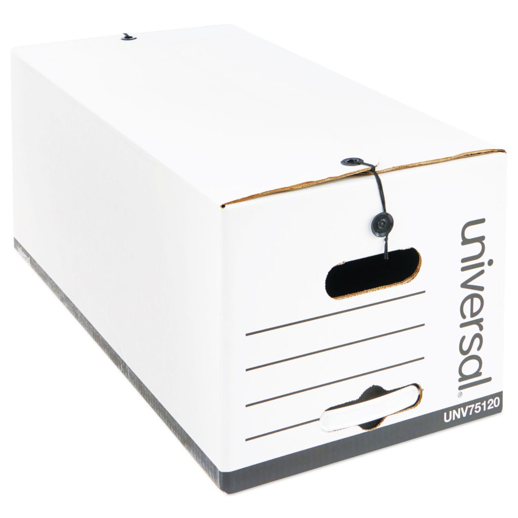 Features heavy-duty construction for lasting box strength. Works with or without shelving for versatile storage. Secure string and button closure keeps documents dust/dirt free.