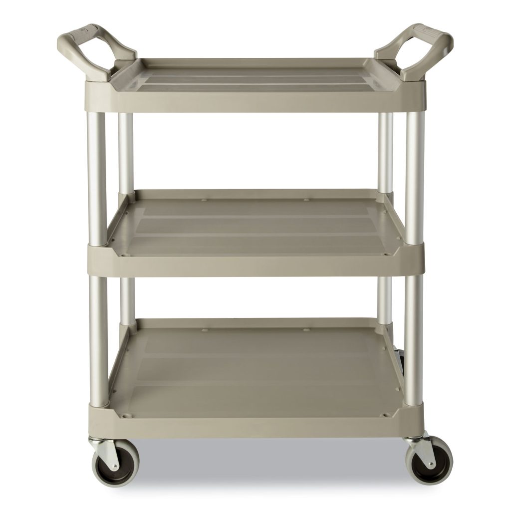 Versatile; for audio/video, filing, food service. Shelves feature 1/4″ lip on three sides and one flat side for easy loading. Brushed aluminum uprights, dual molded handles. Color: Platinum; Color Family: Gray; Capacity (Weight): 200 lbs; Caster/Glide/Wheel: Four 4″ Non-Marking Swivel Casters.