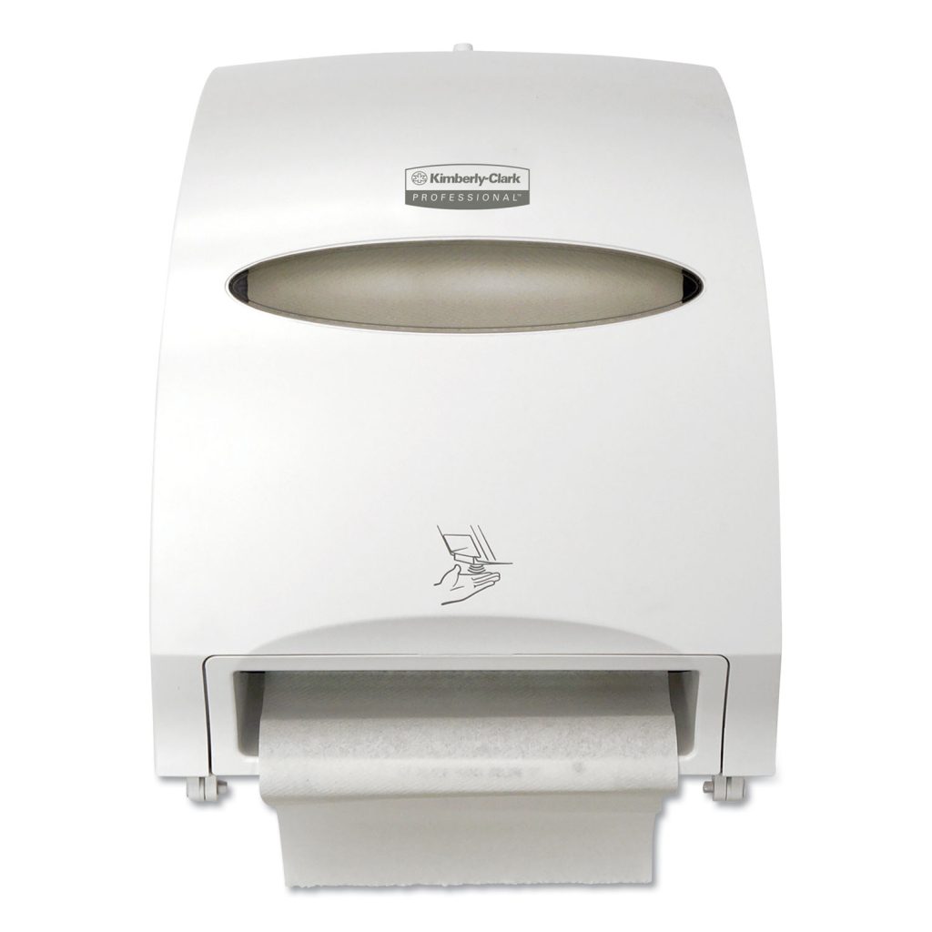 Reduce the hassle of restroom maintenance with the high-capacity Kimberly-Clark Professional Automatic Towel Dispenser. This touchless, wall mount roll towel dispenser needs infrequent refilling and provides consistent, reliable performance. Your washroom guests will enjoy the benefits of hygienic, touch free dispensing – they’ll only touch the towel they’re using. This high capacity towel dispenser is made of high impact smoke colored plastic. The unit dispenses a nominal 11″ of towel when activated by placing hand under the unit. A second sheet will dispense at 10% reduced length when activated within a few seconds. Features include a quiet dispensing system, quick load capability and choice of key-activated spring lock or push button operation. Towels Dispensers Type: Hardwound Roll Towel Dispenser; Capacity (text): 950 ft Roll; Material(s): Plastic; Color(s): White.