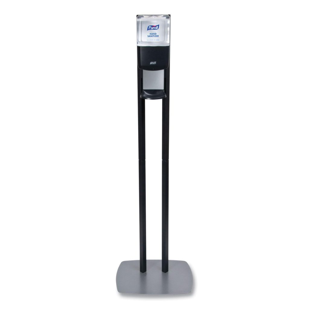 Freestanding design, ideal for high-traffic areas. Includes PURELL ES8 Hand Sanitizer Dispenser. Low profile baseplate designed to maximize stability. Lightweight and easily moved when cleaning the facility. Silver baseplate hides dirt and always looks good. Mounting: Floor Stand; Holds: 1,200 mL; Material(s): Plastic; Metal; Color(s): Graphite/Silver.