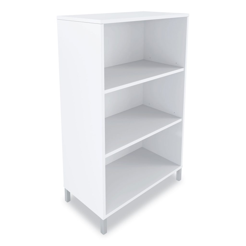 Boost productivity through increased organization. Sharp lines bring contemporary styling to your office. Adjustable shelving lets you create a customized setup. Cable management grommet keeps cords and wires out of sight, making this bookcase great for a phone, fax or other office electronics. Includes wall attachment hardware for safety. Three ShelvesTwo Adjustable. Color: White; Color Family: White; Material(s): Laminate; Shelf Count: 3.