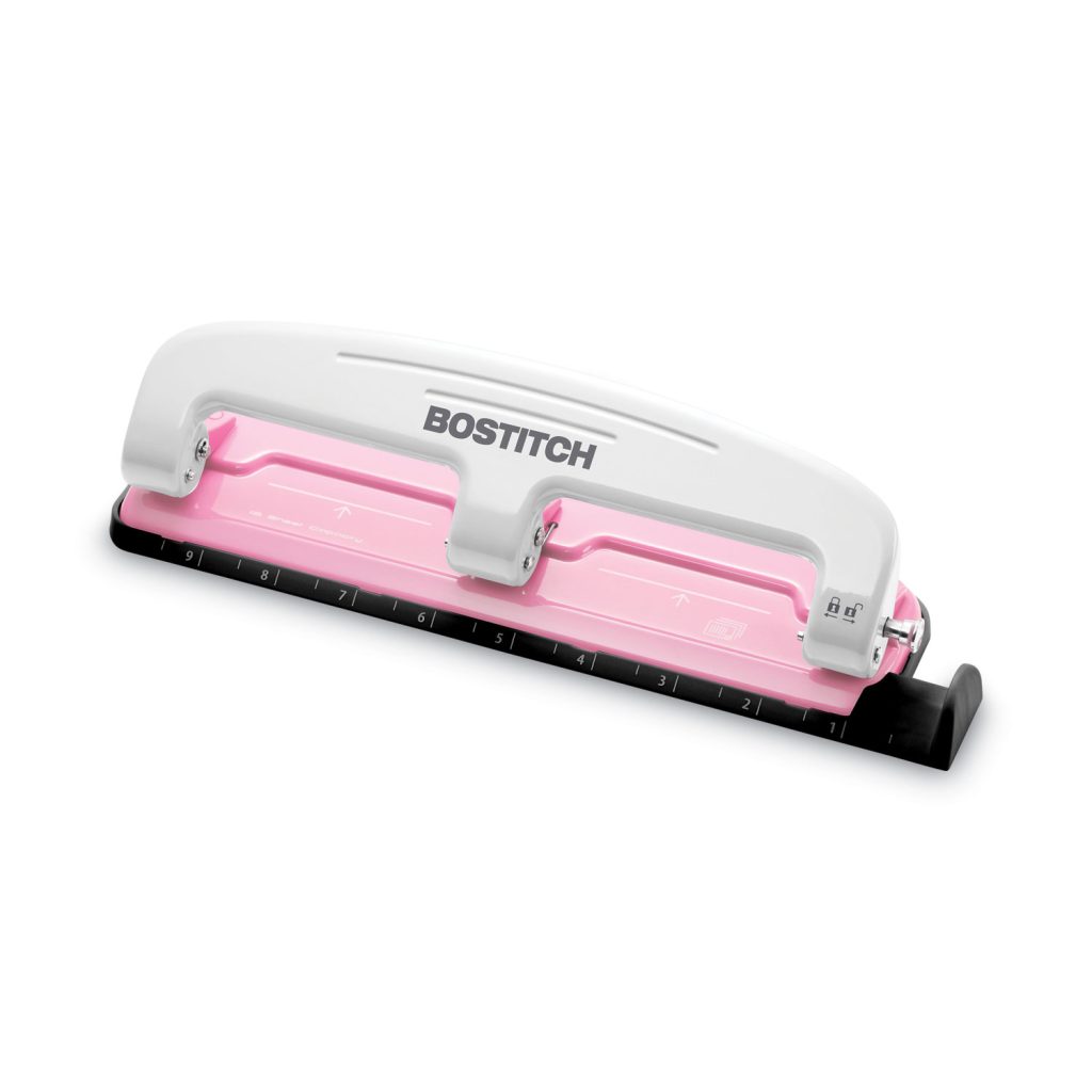 Long-lasting, 50% easier hole punching with ProPunch paper-punch technology. Built-in ruler and paper guide ensure consistent hole placement while the non-slip rubber base provides stability during use. Compact in size, the punch has a convenient handle lock for storing in tight spaces. Internal chip chamber empties through a rear door for tidier chip disposal, without removing the entire punch base. Durable all-metal body. Smooth, jam-free performance. A portion of the proceeds from the sale of this item will be donated to cancer charities via the AMAX Spirit Foundation. Sheet Capacity: 12; Operating Method: Manual; Number of Holes: 3; Hole Diameter: 9/32″.