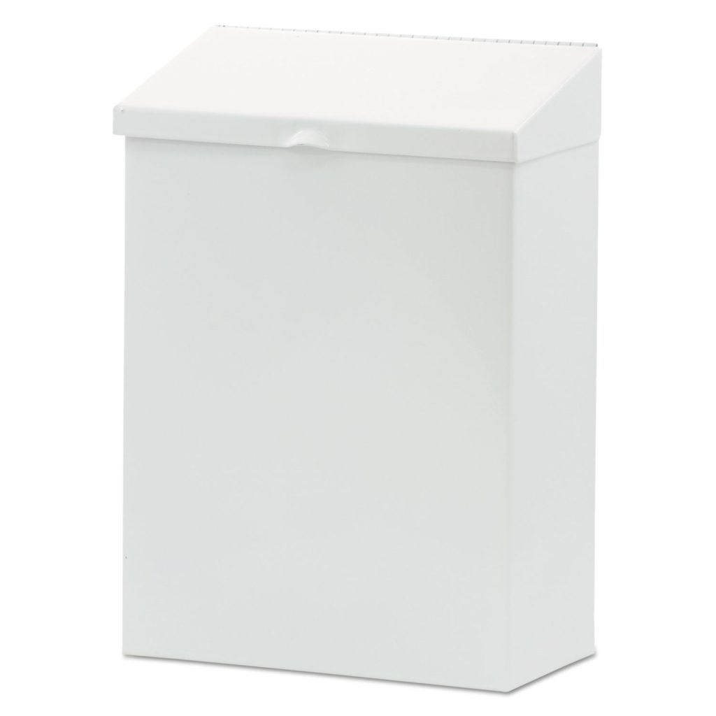 Hinged lid allows waste receptacle to remain open when necessary and to close tightly after waste disposal. Mounts conveniently on any wall. White waste receptacle complements restroom decor and creates the image of cleanliness. Waste Receptacle Type: Sanitary Napkin Bin; Material(s): Metal; Application: Sanitary Napkin Disposal; Color(s): White.