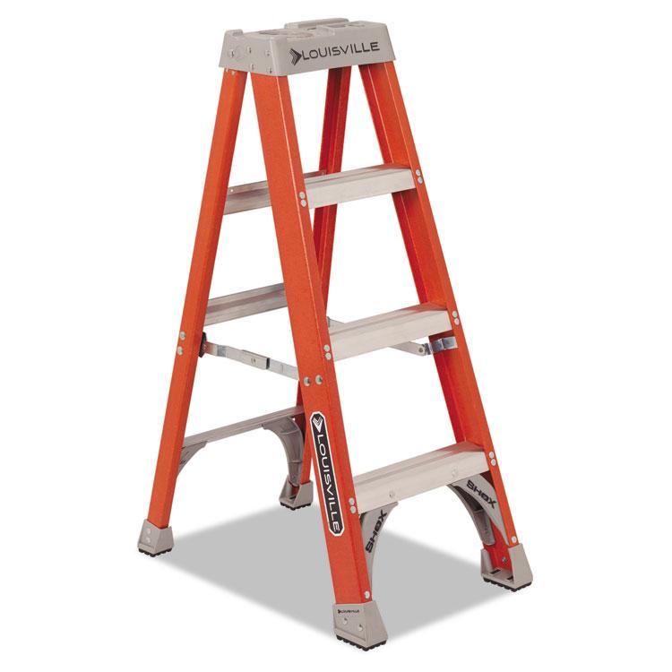 Heavy-duty industrial ladder has a 300 lb. duty rating and is made from non-conductive fiberglass. Industrial grade molded plastic ProTop has a magnet, slots for power and hand tools, 2″ x 4″s and pipe, a tray for paint cans and curved front for leg and body comfort. SHOX impact absorption system provides better protection against damage when dropped on end. Da Boot full coverage extra-grip rubber feet ensure slip-resistant use of all legs. 3-Step. Material(s): Fiberglass; Color(s): Orange; Number of Steps: 3; Duty Rating: 300 lbs.