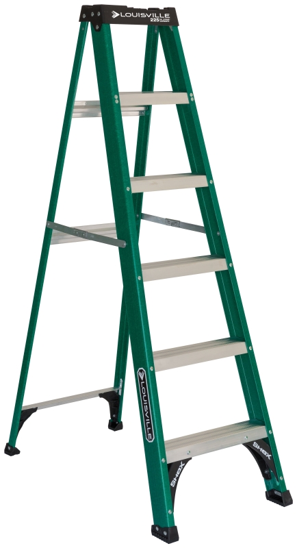 This Louisville 6 ft non-conductive fiberglass step ladder has a load capacity of 225 lb, rated ANSI Type II. This ladder is equipped with the innovative ProTop with multiple tool slots, SHOX impact absorption system, slip-resistant rubber boot, pinch-resistant spreader braces and wide back braces. The Louisville FS4006 step ladder meets or exceeds the safety standards set by ANSI, CSA and OSHA.