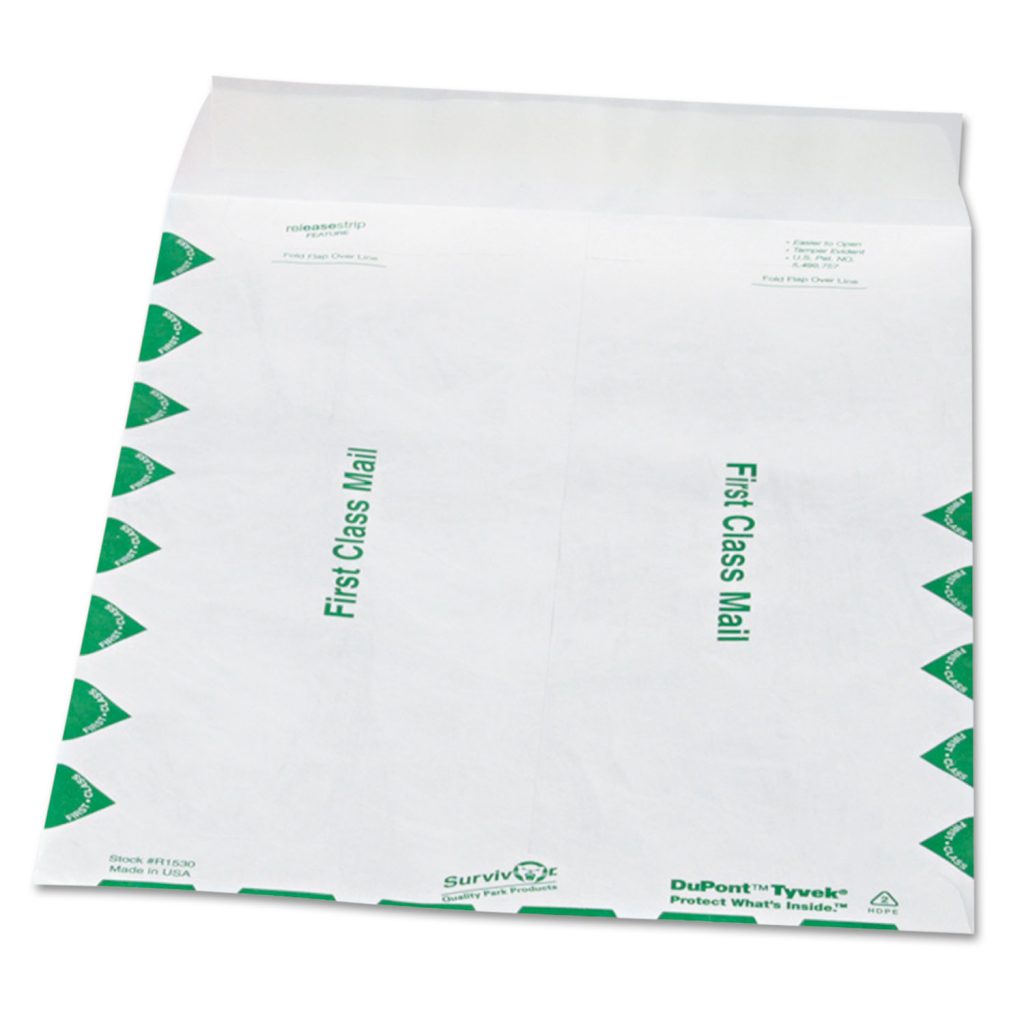 Quality Park Survivor Catalog Mailers are made with durable 14-lb DuPont Tyvek, which is strong enough to withstand the most grueling conditions. The material is puncture, tear and moisture resistantvirtually indestructible. Yet, it is still lightweight which can provide a savings on shipping costs. These white mailing envelopes feature an easy Flap-Stik closure which requires no moisture for a secure seal and a release strip for quick, easy opening. Seam Type: Center; Flap Type: Square; Trade Size: #12 1/2; Security Tinted: No.