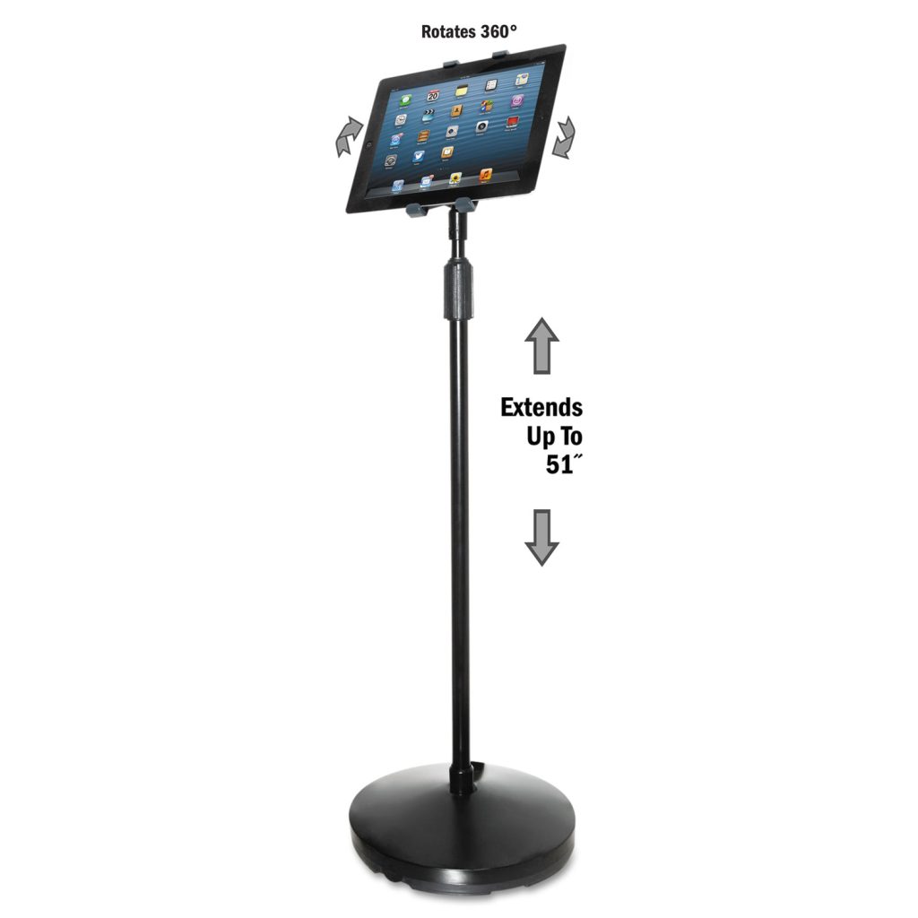 Great for use in conference and boardroom presentations, hotels and restaurants, this floor stand provides easy hands-free access to your tablet. Raise, rotate, angle, and swivel your tablet for optimum viewing in landscape or portrait position. Weighted base provides excellent support. Easy to attach and remove tablet. OEM/Compatible: Compatible; Workstation Type: Mobile Workstation; Color(s): Black; Color Family: Black.