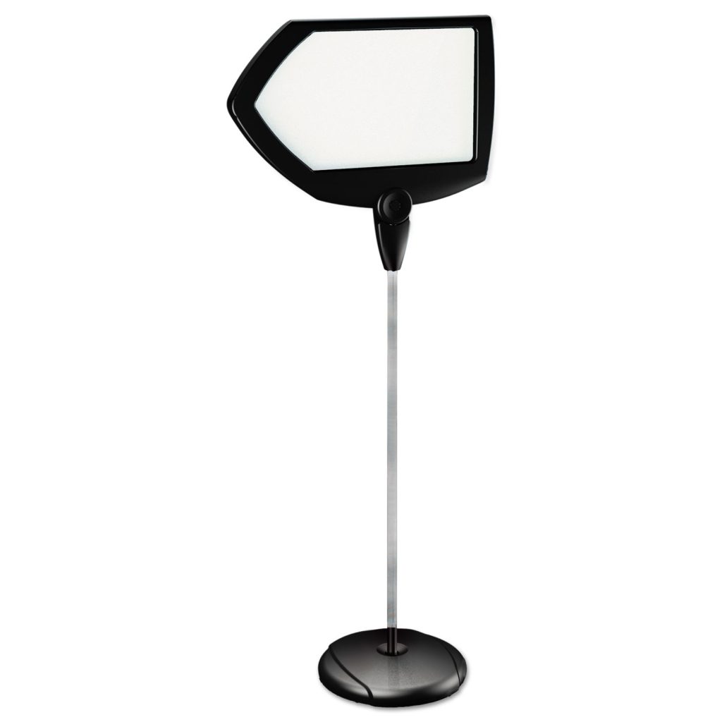 Extremely versatile, MasterVision sign holders offer a simple and efficient solution for displaying information that needs to be regularly updated. Steel support leg easily adjusts to a height that’s perfect for your needs. Magnetic dry erase surface allows you to make updates quickly and easily. Weighted base keeps the sign in place. ArrowMaximum height 63″. Board Type: Magnetic Dry Erase; Board Width: 25″; Board Height: 17″; Surface Material: Enameled Steel.