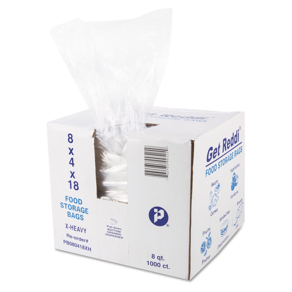 Compact packaging saves you counter and shelf space. Quick-dispensing design allows easy access and reduces waste. All products are FDA-approved for safe food service, storage and handling. Manufactured from Linear Low Density (LLDPE) film. Application: Foodservice; Capacity Range (Volume) [Max]: 8 qt; Thickness: 1.2 mil; Grade: Super Extra Heavy-Duty.