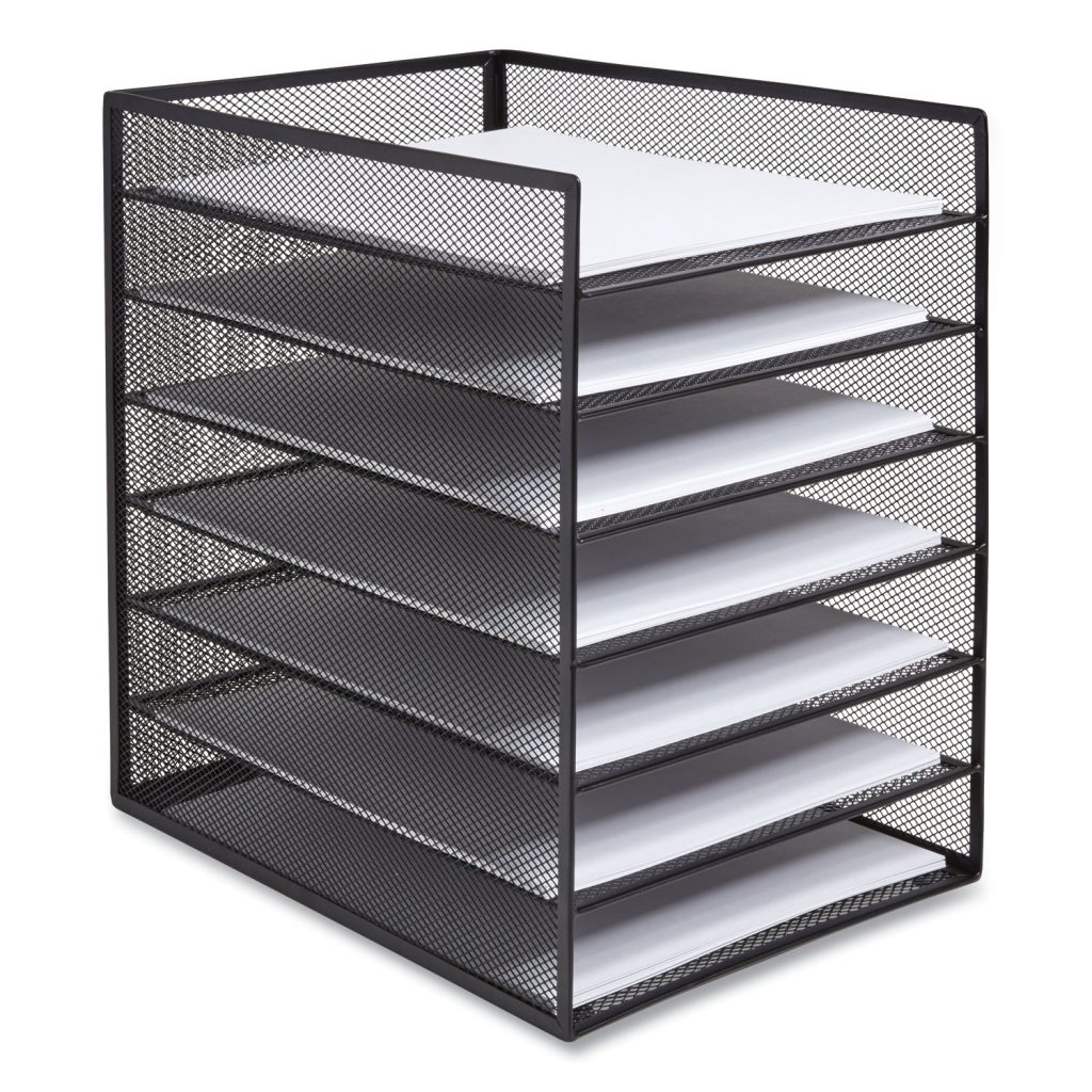 Customize your organization system to meet your needs. This versatile storage solution accommodates notebooks, paper pads, files, forms, documents and office supplies. A sleek design aesthetic featuring a tightly woven metal-mesh body with reinforced ribbing and a flat-square frame with rounded edges delivers reliable performance with a contemporary, professional flair. Front-Load Enclosed DesignSolid metal base and six adjustable-height compartments. Number of Compartments: 6; For File Size: Letter; Load Orientation: Front; Color(s): Matte Black.
