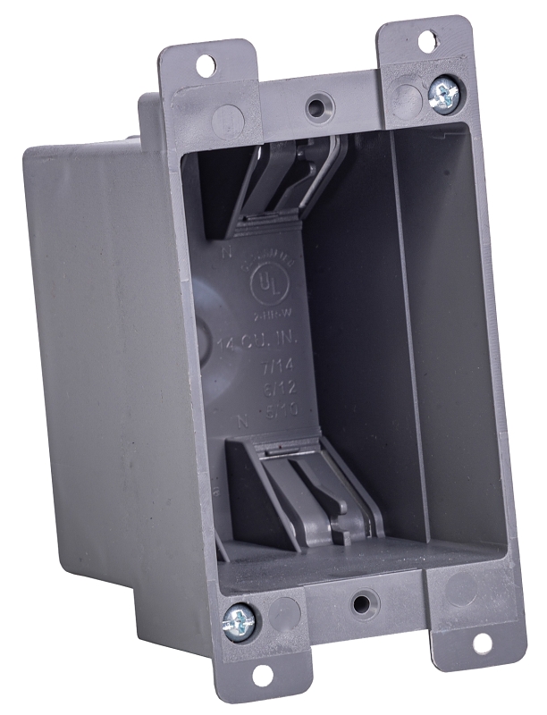 GB Switch/Outlet Box, Outlet Type: Standard, Cable Entry: Hinge, Number of Knockouts: 4, Number of Gangs: 1, Rectangular, Cubic Capacity: 14 cu-in, Dimensions: 4.38 in H x 2.25 in W x 2.75 in D, PVC, Gray, In-Wall Mounting, Suitable for: Non-Metallic Sheathed Cable and Non-Metallic Raceway, Includes: Mounting Ears/Flanges and Adjustable Mounting Tabs