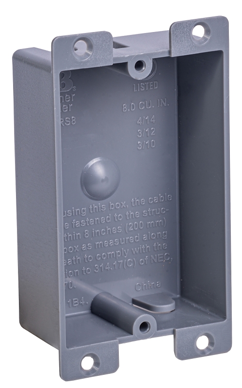 GB Switch/Outlet Box, Outlet Type: Shallow, Cable Entry: Hinge, Number of Gangs: 1, Rectangular, Cubic Capacity: 8 cu-in, Dimensions: 1.25 in H x 2.4 in W x 4.25 in D, PVC, Gray, In-Wall Mounting, Suitable for: Non-Metallic Sheathed Cable and Non-Metallic Raceway, Includes: Mounting Ears/Flanges and Adjustable Mounting Tabs