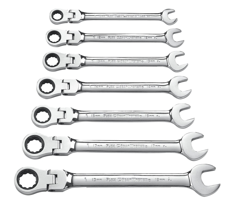 Flex heads provides greater access in tight spaces. Set of full polish, fine-toothed combination ratcheting wrenches with Surface Drive Plus Technology. Combines the speed of a ratchet and the access capabilities of a wrench. Includes 10 mm, 12 mm, 13 mm, 14 mm, 15 mm, 17 mm and 19 mm.