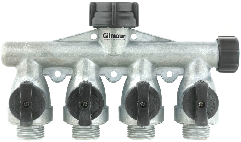 45% more water flow. More performance from sprinklers and nozzles. Four way shut-off valve controls water flow. Heavy-duty aluminum construction. Extra-large handles for easy grip and turn. Easy-on swivel connector assures accurate connection to faucet. Withstands hot water temperatures.