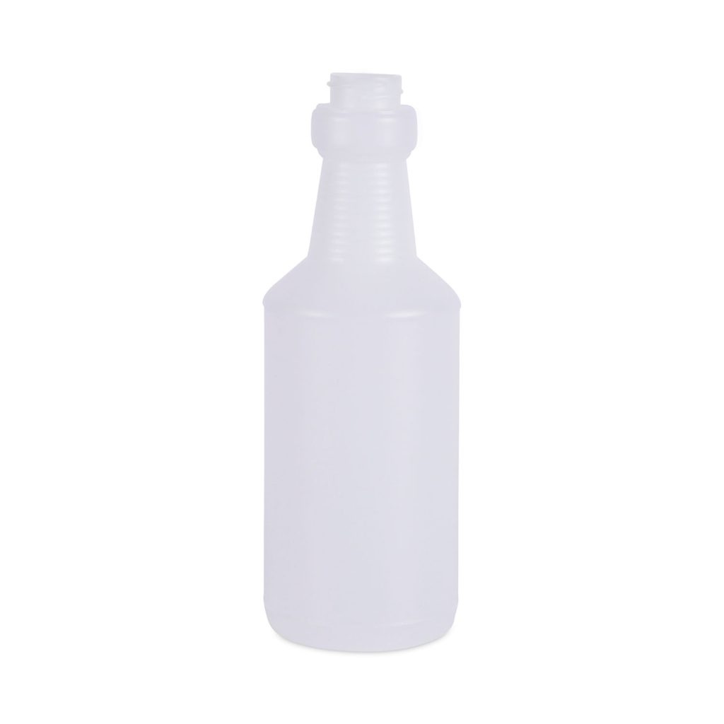 Sturdy bottle, with unique design allows user to hold bottle easily and naturally, regardless of hand size. Durable, HDPE bottle. Easy-to-use, multi-purpose bottle is a great choice for everyday cleaning tasks. Material(s): HDPE; Color(s): Clear; Capacity (Volume): 16 oz; For Use With: Boardwalk Trigger Sprayers: 09227, 58108, 72108.