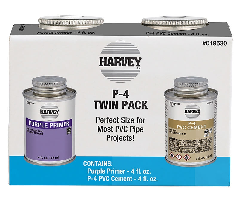Convenient project pack contains 4 oz purple primer and 4 oz PVC solvent cement. For most PVC pipe projects. Twin pack.