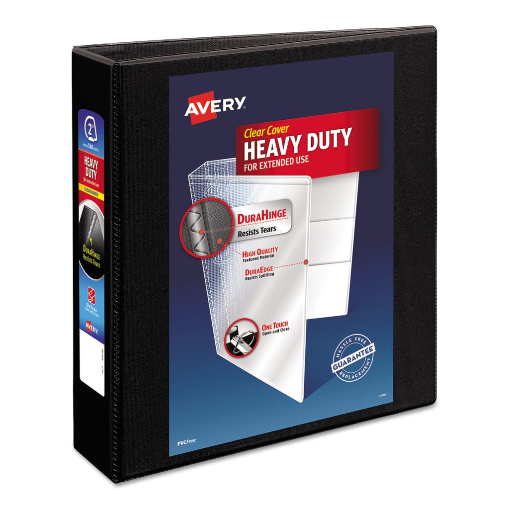 With this Heavy-Duty Nonstick View Binder you get one-touch operation and the durability required for everyday use. Nonstick material won’t lift ink or toner off printed pages. Tear-resistant DuraHinge design is stronger and lasts longer. DuraEdge feature makes the sides and top more pliable, providing greater split resistance. Deeply textured film offers a smoother finish and features a linen pattern for a high-quality look and feel. Four clear, interior pockets provide extra storage space. Wider front and back panels fully cover standard dividers and sheet protectors. Slant rings have a higher page capacity when compared to the same size round rings. Pages lie flat with back-mounted rings (exposed rivets on back). Customize your title page using free templates and designs at Avery Design & Print Online. One Touch Slant RingsOpens easily and holds more sheets than the same size round rings. Binder Type: Ring; Binder Style: View; Binder Size Capacity: 2″; Binder Sheet Capacity: 500.