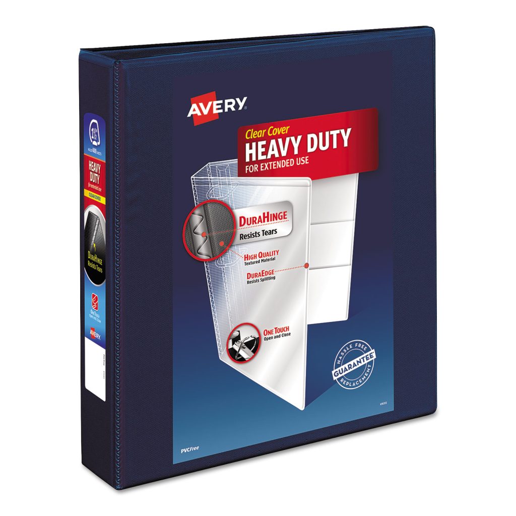 Heavy-Duty view binder with one touch EZD rings is perfect for long-term, regular use. Tear-resistant DuraHinge design is stronger and lasts longer. DuraEdge feature makes the sides and top more pliable, providing greater split resistance. Deep-textured film offers a smoother finish and features a linen pattern for a high-quality look and feel. Clear cover and spine for easy customization. Four clear, interior pockets provide extra storage space. Wider front and back panels fully cover standard dividers and sheet protectors. One touch EZD rings provide easy access and have a higher page capacity when compared to the same size round rings. Customize the cover with free, easy-to-use templates and designs at Avery Design & Print online. Binder Type: Ring; Binder Style: View; Binder Size Capacity: 1.5″; Binder Sheet Capacity: 400.