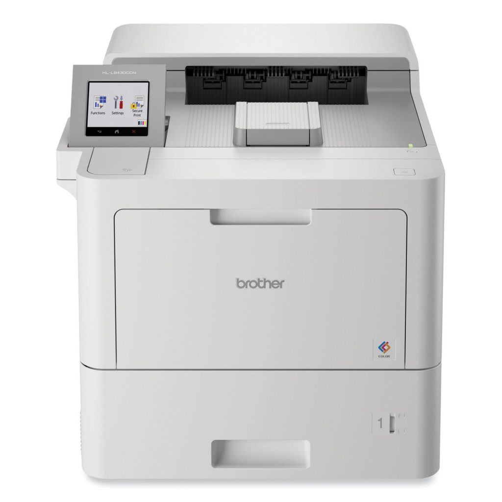 The Brother Workhorse HL-L9430CDN Enterprise Color Laser Printer is designed for how work now works. Providing enterprise-level performance, advanced security features, and reliable output. Offers built-in value with included Brother Genuine 9,000-page black and 6,500-page color toner cartridges. Delivers the lowest laser color cost per page ever from Brother by using the TN815 super high-yield replacement toner cartridges for 15,000 pages black and 12,000 pages color. Fast print speeds up to 42 ppm and a 3.5″ color touchscreen. Advanced security features. 620-sheet total standard paper capacity. Gigabit Ethernet networking with availability of an optional dual band (2.4GHz/5GHz) wireless module (sold separately). Easily print from mobile devices. Maximum Print Speed (Black): 42 ppm; Maximum Print Speed (Color): 42 ppm; Print Resolution (Black) (Width x Height): 2400 x 600 dpi; Print Resolution (Color) (Width x Height): 2400 x 600 dpi.