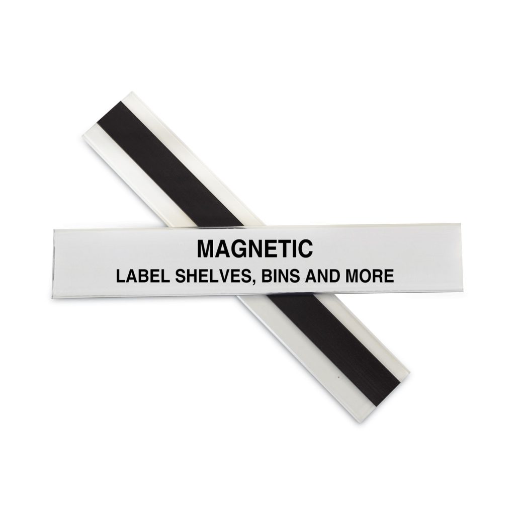 Label shelving units, racks and more with ease and efficiency. Magnetic clear plastic holders stick to virtually any clean, flat surface. Relabeling is simple, just slide in new white paper insert (included). Can be cut to any size. Comes in a length of six inches. Color(s): Clear; Size: 1 x 6; Load Style: Side; Material(s): Plastic.
