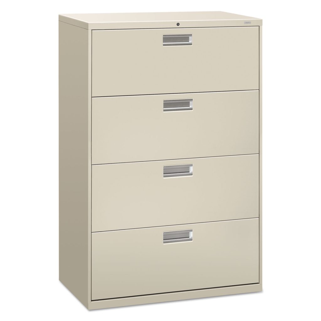HON Brigade 600 Series 4-Drawer Lateral – 36″ x 18″ x 52.5″ – 4 x Drawer(s) for File – A4, Legal, Letter – Lateral – Interlocking, Leveling Glide, Ball-bearing Suspension, Recessed Handle, Label Holder, Durable – Light Gray – Baked Enamel – Steel – Recycled| Four-drawer lateral file offers exceptional construction with double-walled base construction for maximum rigidity. Baked enamel finish over rust-inhibiting, phosphate pretreatment adds more durability. Telescoping, ball-bearing suspension delivers remarkably smooth drawer operation. Drawers accommodate letter-size or legal-size folders from side-to-side with included adjustable hangrails. Drawers are flush at the top and sides and feature drawer-extension restraint, plastic label holders and aluminum, recessed drawer pulls. Mechanical interlock allows only one drawer to open at a time. 36″ wide lateral file also offers four adjustable leveling guides for stabilizing; HON One Key interchangeable, core-removable lock; and reinforced case steel construction. Lock mechanism secures both sides of drawers.Four-drawer lateral file offers exceptional construction with double-walled base construction for maximum rigidity. Baked enamel finish over rust-inhibiting, phosphate pretreatment adds more durability. Telescoping, ball-bearing suspension delivers remarkably smooth drawer operation. Drawers accommodate letter-size or legal-size folders from side-to-side with included adjustable hangrails. Drawers are flush at the top and sides and feature drawer-extension restraint, plastic label holders and aluminum, recessed drawer pulls. Mechanical interlock allows only one drawer to open at a time. 36″ wide lateral file also offers four adjustable leveling guides for stabilizing; HON One Key interchangeable, core-removable lock; and reinforced case steel construction. Lock mechanism secures both sides of drawers.
