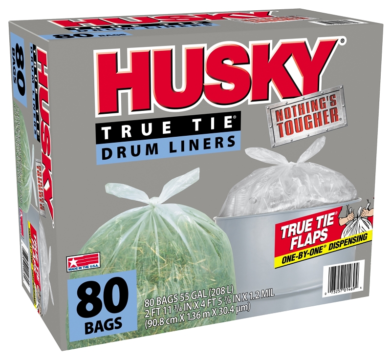 Husky Trash Bag, 55 gal Capacity, Clear, 1.2 mil Thickness, Flap Tie Closure, Suitable for: Drums
