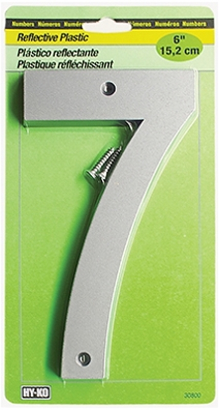 HY-KO 30800 Series Reflective Sign, Character: 7, 6 in H Character, Black/Silver Character, Plastic, 5/16 in Thick Dimensions, Includes: Screws