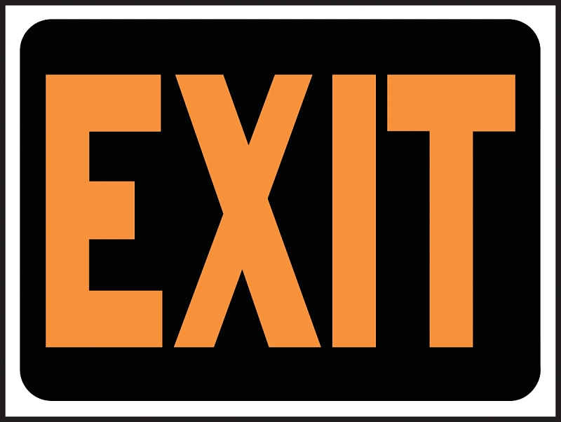 Brightly visible, fluorescent letters on a black background. Durable plastic, weatherproof. Sign states “EXIT”.