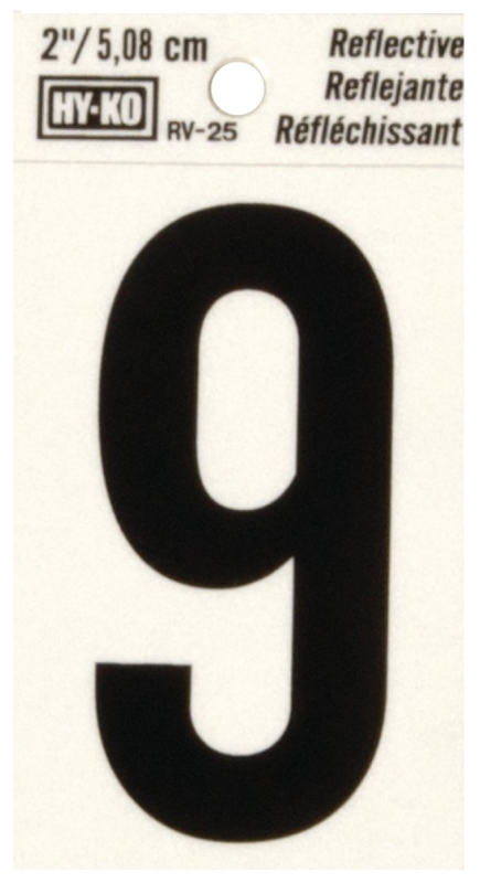 HY-KO RV-25/9 Reflective Sign, Character: 9, 2 in H Character, Black Character, Silver Background, V