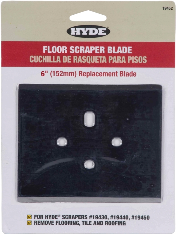 Hardened carbon steel blade with two sharpened edges for long life. Can be resharpened. Replacement blade for HYDE hammer scrapers #19430, 19440 or 19450.