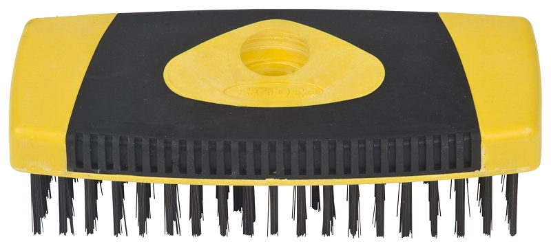 Stiff wire carbon steel block scrub brush with 1-1/4 in bristles handles big cleaning jobs. Great heavy-duty wire scrubbers. Can be used to attach to poles with acme thread for comfortable floor cleaning. Brush area measures 2-1/8 x 6-5/8 in. Overmold handle.