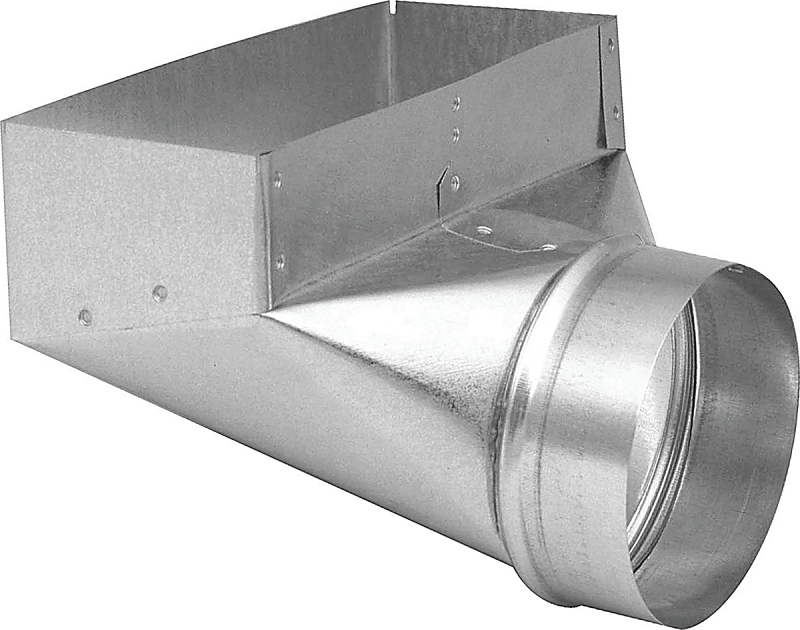 Used for right-angle transition from round pipe or insulated flexible duct to a register or grille.