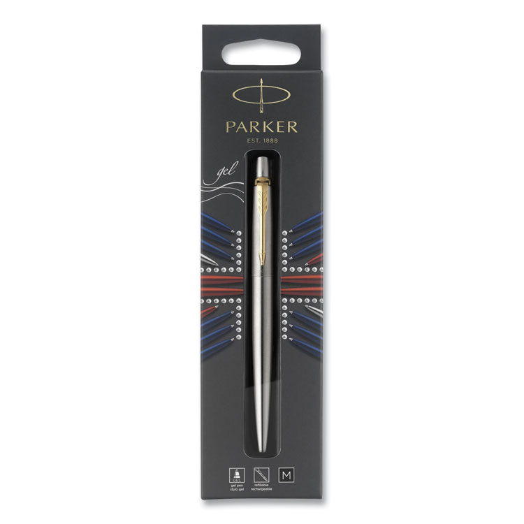 Create easy-to-read messages for members of your team with this black ink pen. The medium point size delivers your ideas in bold ink that resists fading, while the retractable design makes this pen easy to use with a simple click. This refillable Parker Jotter rollerball ink pen is made of stainless steel with a gold trim barrel for a firm grip and a pocket clip for convenient carrying. Pen Sub-Brand & Product Family: Jotter; Pen Type: Roller Ball Pen; Pen Style: Retractable; Pen Tip Type: Conical.