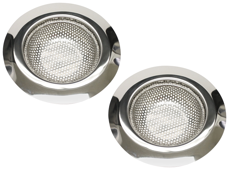 This two pack of strainers features 2 mm holes drilled into the strainer to prevent clogging in kitchen sinks and allow food particles to be collected while allowing water to easily flow through. These strainers offer a long lasting look that completely covers existing drains enhancing the look of kitchen sinks.