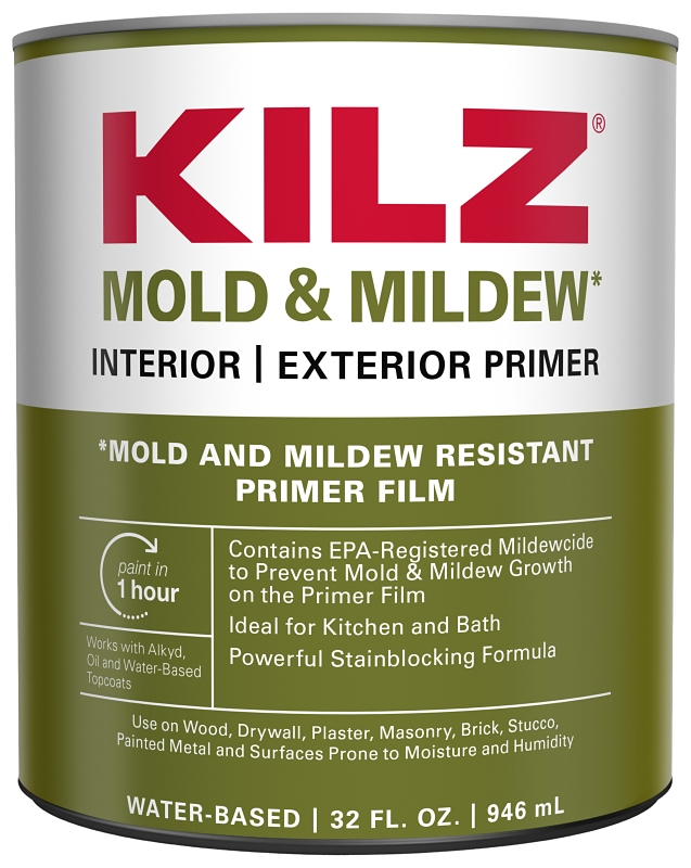All New KILZ mold and mildew primer is a water-based primer-sealer-stainblocker that is specially designed for residential surfaces in high humidity, moisture and temperature environments such as kitchens, bathrooms, powder rooms and laundry rooms. It offers excellent adhesion to both interior and exterior surfaces and provides a sound anchor for paints. The EPA registered active ingredient creates a mold and mildew-resistant film that protects the primer film from mold and mildew growth. KILZ mold and mildew Primer will block most medium to heavy stains including felt marker, grease, ink, pencil, tannin and water stains. It is a fast drying, low odor, very low VOC formula and is easy to clean with soap and water. Not recommended for floors.