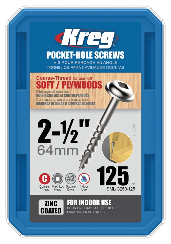 Kreg SML-C250-125 Pocket-Hole Screw, #8 Thread, 2-1/2 in L, Coarse Thread, Maxi-Loc Head, Square Dri
