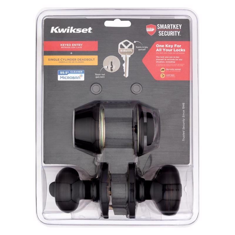 Finish: Venetian Bronze | Knob Style: Round | Material: Metal | Maximum Door Thickness: 2-3/4 | Minimum Door Thickness: 2-3/8 | Packaging Type: Carded | Brand Name: Kwikset | Product Type: Entry Knob and Single Cylinder Deadbolt | Adjustable Backset: Yes | Security Grade: ANSI/BHMA Grade 3 | Style: Classic | Sub Brand: SmartKey Security | Trim Rings: Yes | Commercial or Residential: Residential | Compatible Key Numbers: KW1 | Cylinder Type: Single Cylinder | Door Direction: Left or Right Handed | Indoor or Outdoor: Outdoor