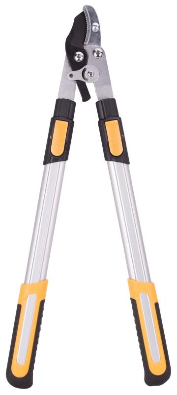 Teflon coated steel cutting blade. Telescopic aluminum handles with ergonomic, two-tone grips. Push-button mechanism adjusts length from 24 to 33 in. Maximum cutting capacity of 1-1/4 in.
