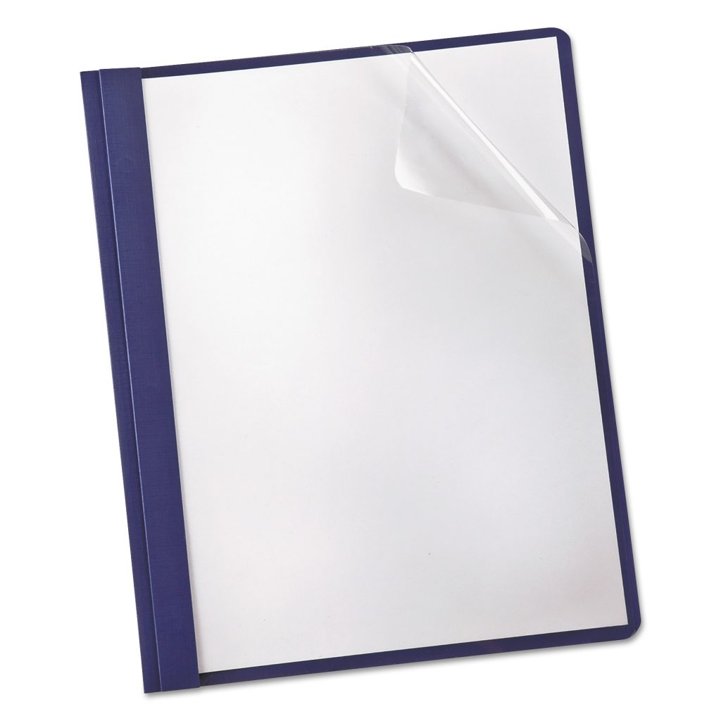 Smooth and clear front cover accentuates title page. Linen-like back cover adds texture and color. Front Cover Color(s): Clear; Color Family: Clear; Back Cover Color(s): Navy; Sheet Size: 8 1/2 x 11.