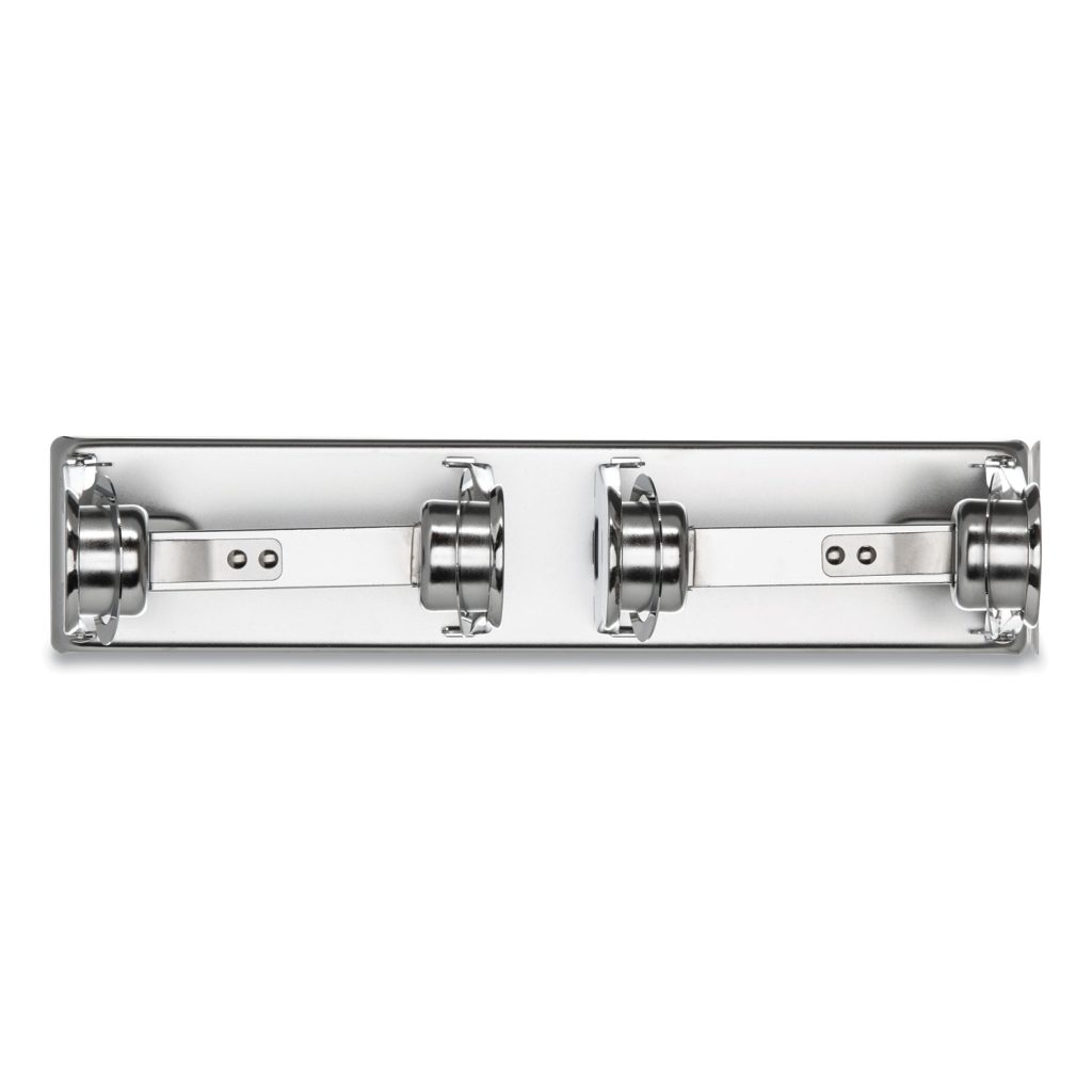 Tension springs prevent wasteful, free rolling of tissue. 20-gauge steel construction with anti-theft lock. Holds standard 1 1/2″ core toilet tissue rolls. Holds Two Rolls. Roll Type: Standard; Capacity (text): Holds Two Standard 1 1/2″ Core Toilet Tissue Rolls; Color(s): Chrome; Material(s): Steel.
