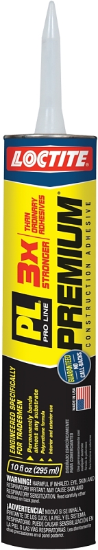 Loctite PL Premium construction adhesive is a one component, polyurethane based, moisture-curing adhesive. It is VOC compliant and contains no chlorinated solvents or water. Loctite PL Premium provides superior adhesion to most common construction materials. Since the bonding strength of PL Premium is so strong, it offers twice the coverage of conventional adhesives therefore much less adhesive is required to complete projects. PL Premium can be used for interior or exterior projects and is 3 times stronger than ordinary solvent based construction adhesives during initial 24 hr cure. It is also waterproof, paintable and cures even in cold temperatures. Ideal for sub floor installations.