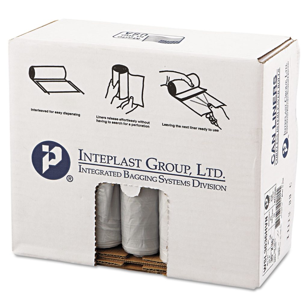Institutional linear low-density bags provide excellent resistance to punctures and tearing. Employs star sealed bottom for even weight distribution. Prime resins used for superior quality. Coreless Interleaved Roll. Application: Can Liner; Capacity Range (Volume) [Max]: 30 gal; Capacity Range (Volume) [Min]: 20 gal; Thickness: 0.58 mil.