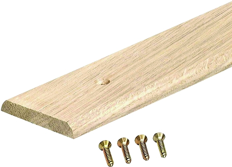 The 2-1/2 x 72 in unfinished hardwood seam binder easily covers a seam or gap between two flooring surfaces of equal height. Seam binders prevent carpet edges from fraying, vinyl floor seams from curling and creates a smooth transition between different flooring surfaces. Seam binders are easily secured to wood and concrete floors with provided screw nails. For installation on concrete floors use wooden pegs.